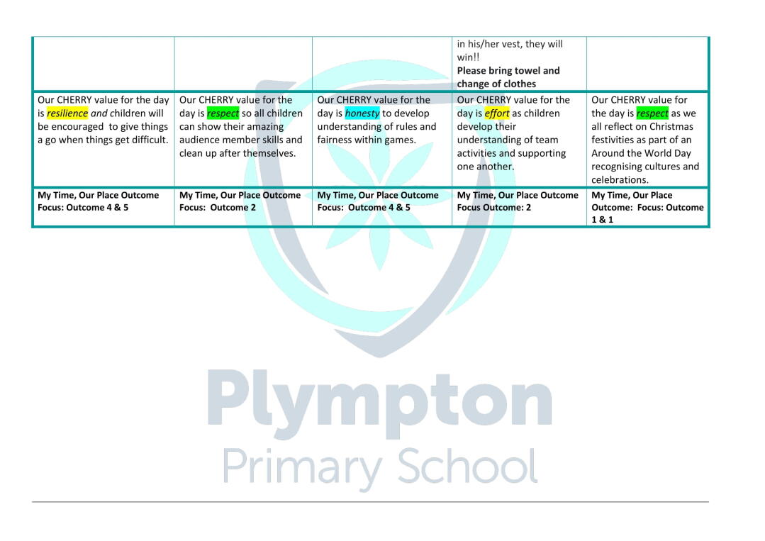 | Monday 5 December- Friday 9 December | Reception- Year 2 Swimming |
