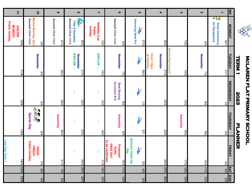 Make sure you check the diary dates for upcoming events and pencil them into your calendars. Also, keep an eye on the newsletter in week 4, as we will hopefully be confirming a number of key dates for the year, including pupil free days, end of year concert etc.