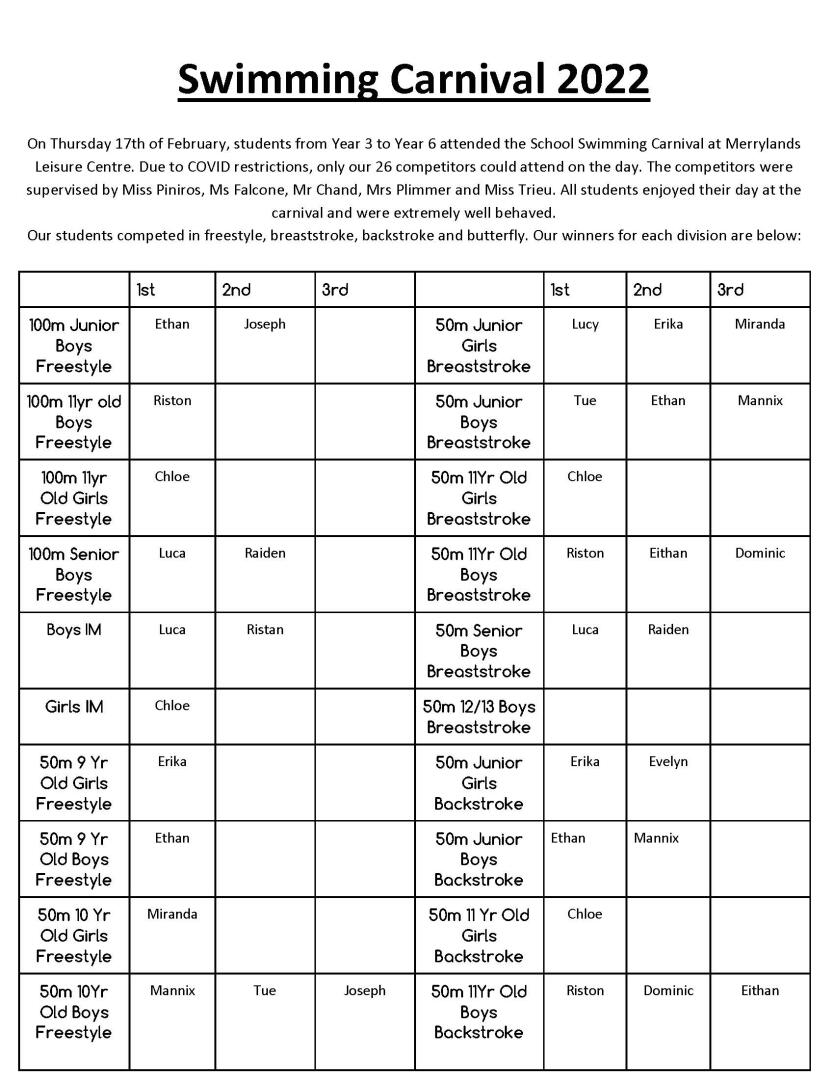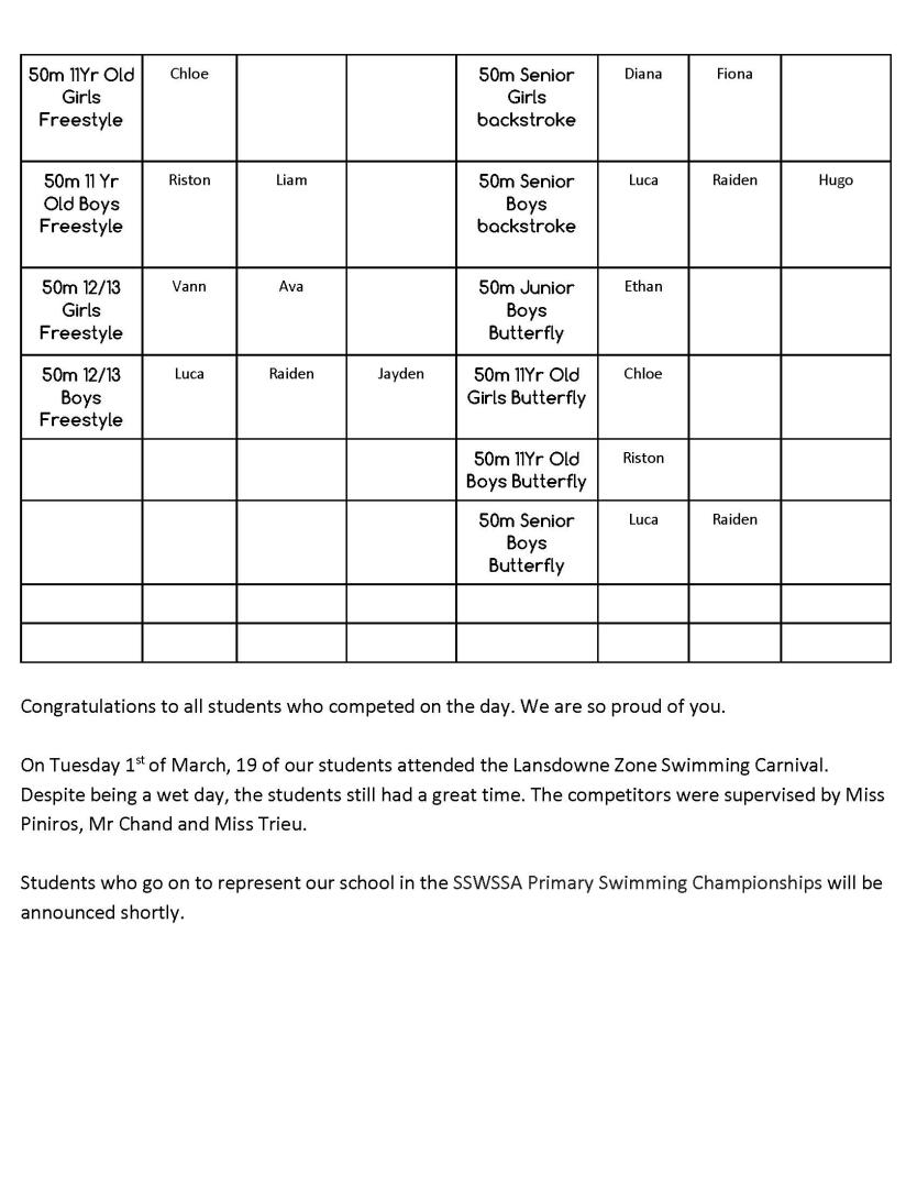 Thank you to Ms Piniros, Ms Trieu and Mr Chand for all your organisation for our school swimming carnival. Congratulations to Ava, Diana, Ristone, Dominic, Chloe, Jayden, Luca, Chhorvann, Raiden, Liam, Evelyn, Miranda, Lucy, Eithan, Tue, Mannix, Erika, Joseph, and Ethan who went on to compete at the Lansdowne Zone Swimming carnival this week. We are still waiting on the results of which students will be invited to the Regional carnival.
