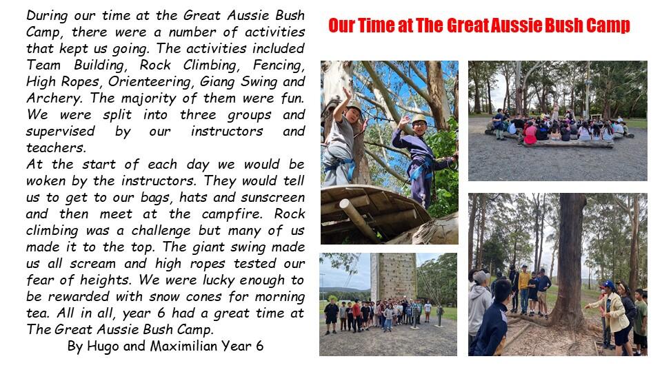 Year 6 enjoyed their time at the Great Aussie Bush Camp last week and have made many memories with their classmates that will last a lifetime. We have many other excursions planned for all grades before the end of term including the Year 5 excursion to Canberra in Week 5. Kinder are off on their first excursion to the farm on Friday and I am sure they will have a great time.