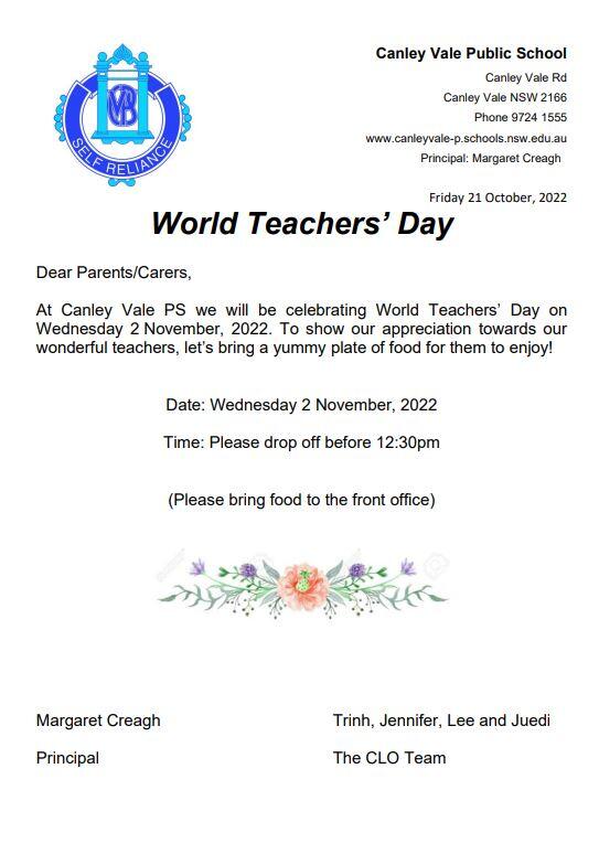 On Wednesday 2 November our CLOs are organising a special lunch for our teachers. Please see the flyer attached to the newsletter for more information.