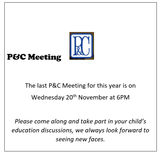 The next P and C meeting has been set down for Wednesday 20 November. There are a lot of issues on the agenda so it would be great if we have a good roll up of parents and carers so all the educational matters on the agenda can be discussed and decided. Just a reminder to all who attend- these meetings are public meetings and as such it is considered inappropriate to discuss teachers or any personal matters you may have with the school.