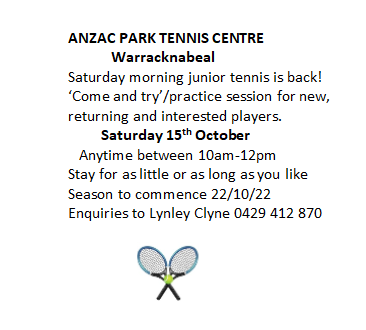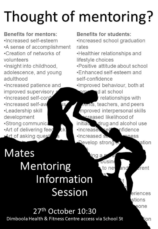 Thursday 27th October – MATES Mentoring Information Session at DMSC for people who would like to be a mentor. 10:30 am start at the Health and Fitness Centre. For further details contact Dian Dent 0400 865 390