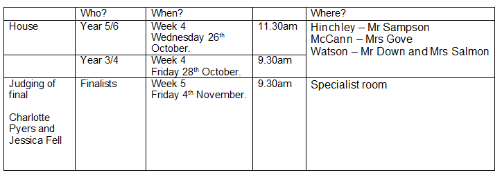 Wednesday 26th October – 11:30 - 5/6 students present to their House Groups for House Public Speaking. (All welcome to attend)