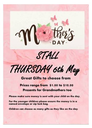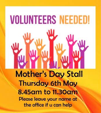 Reminder – Mother’s Day Stall – Thursday 6th May, 8.45 to 11.30am (volunteers greatly appreciated).