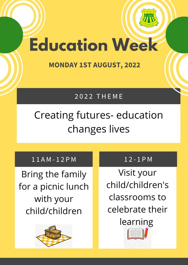 On Monday 1st August we will launch Education Week with a picnic lunch from 11am-12noon and open classrooms from 12-1pm. Please join us as we celebrate all of the wonderful aspects of our school and of Public Education.
