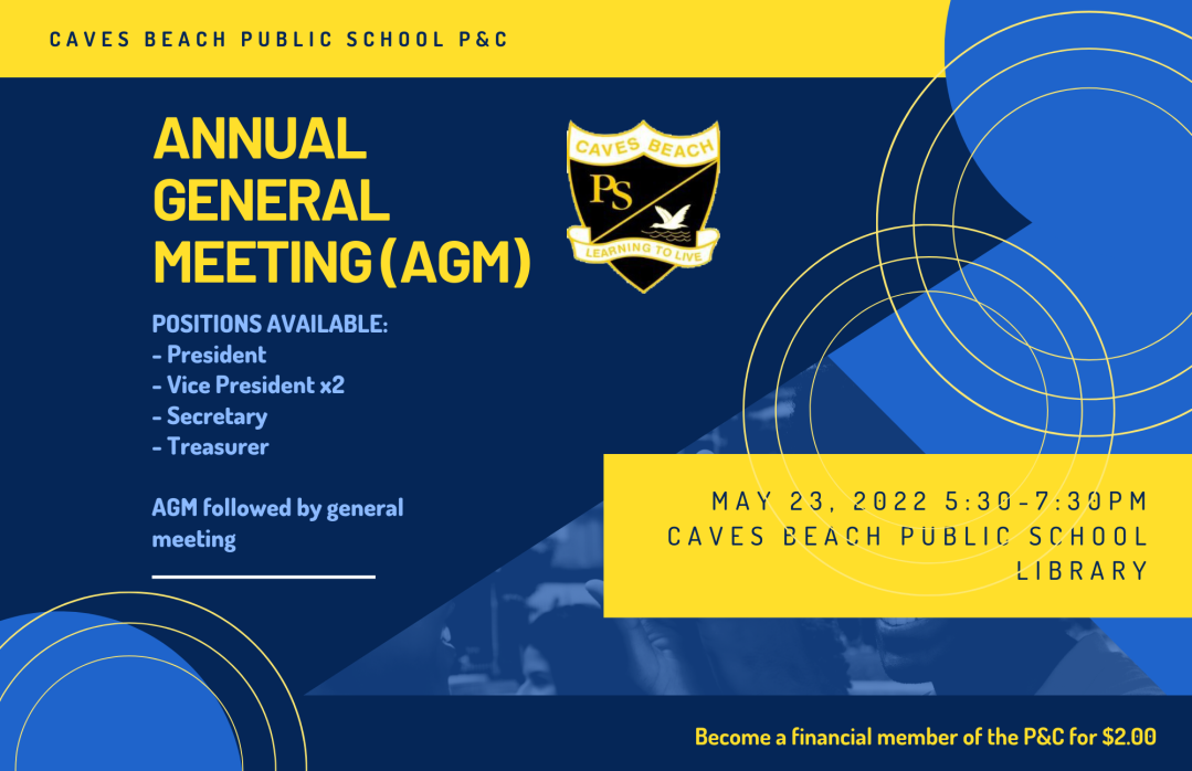 The P&C will be holding its Annual General Meeting Monday 23rd May in the school Library from 5.30 -7.00pm. For any further information please email the P&C - cavesbeachpublicschool@pandcaffiliate.org.au