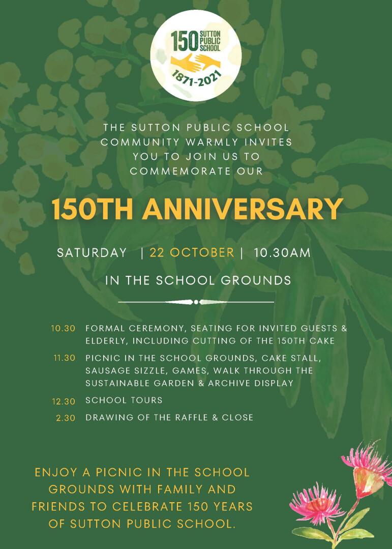 A sesquicentenary is a significant milestone and though COVID restrictions put celebrations on hold last year, I am excited to finally be able to bring staff and students from past and present, and the wider community together to celebrate Sutton Public School’s 150th anniversary.